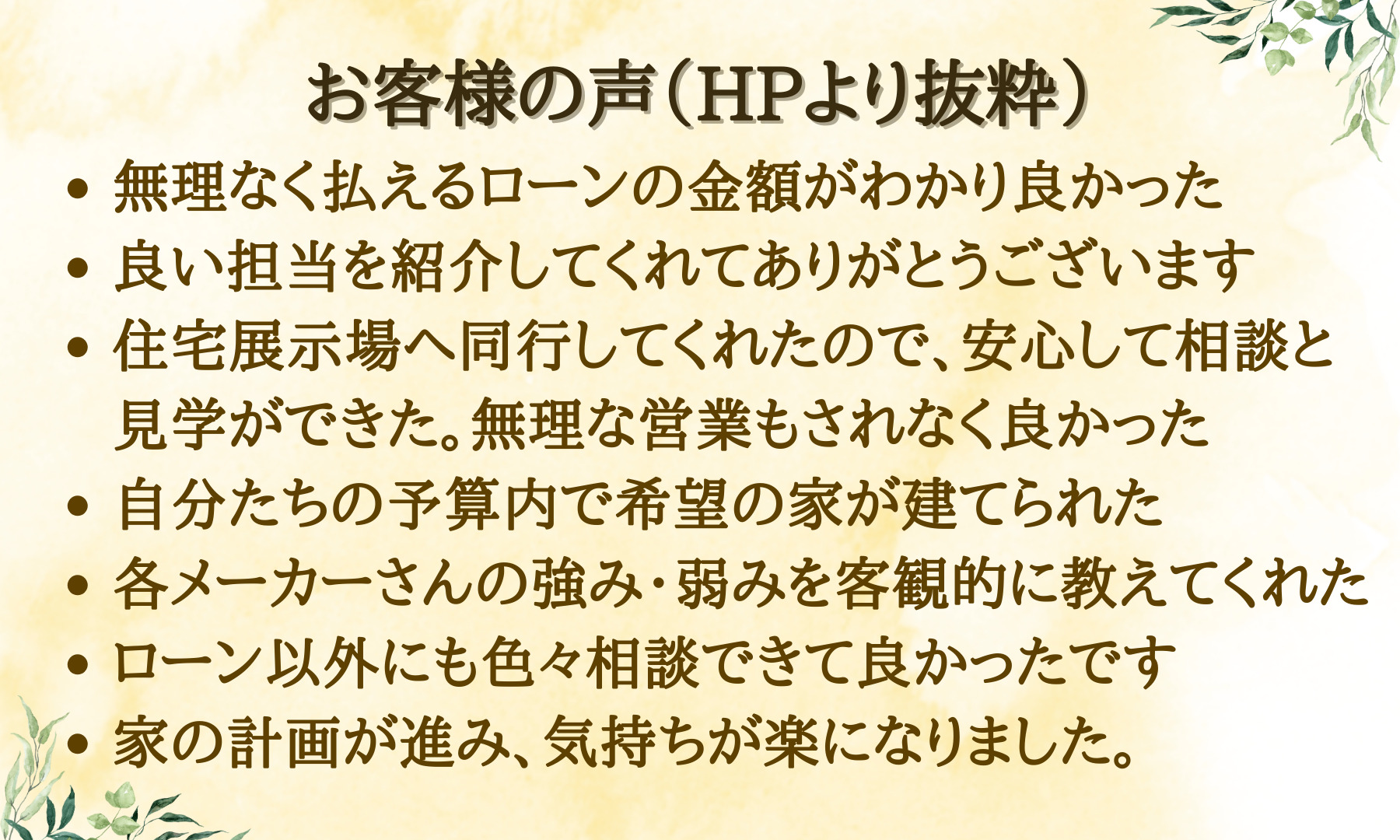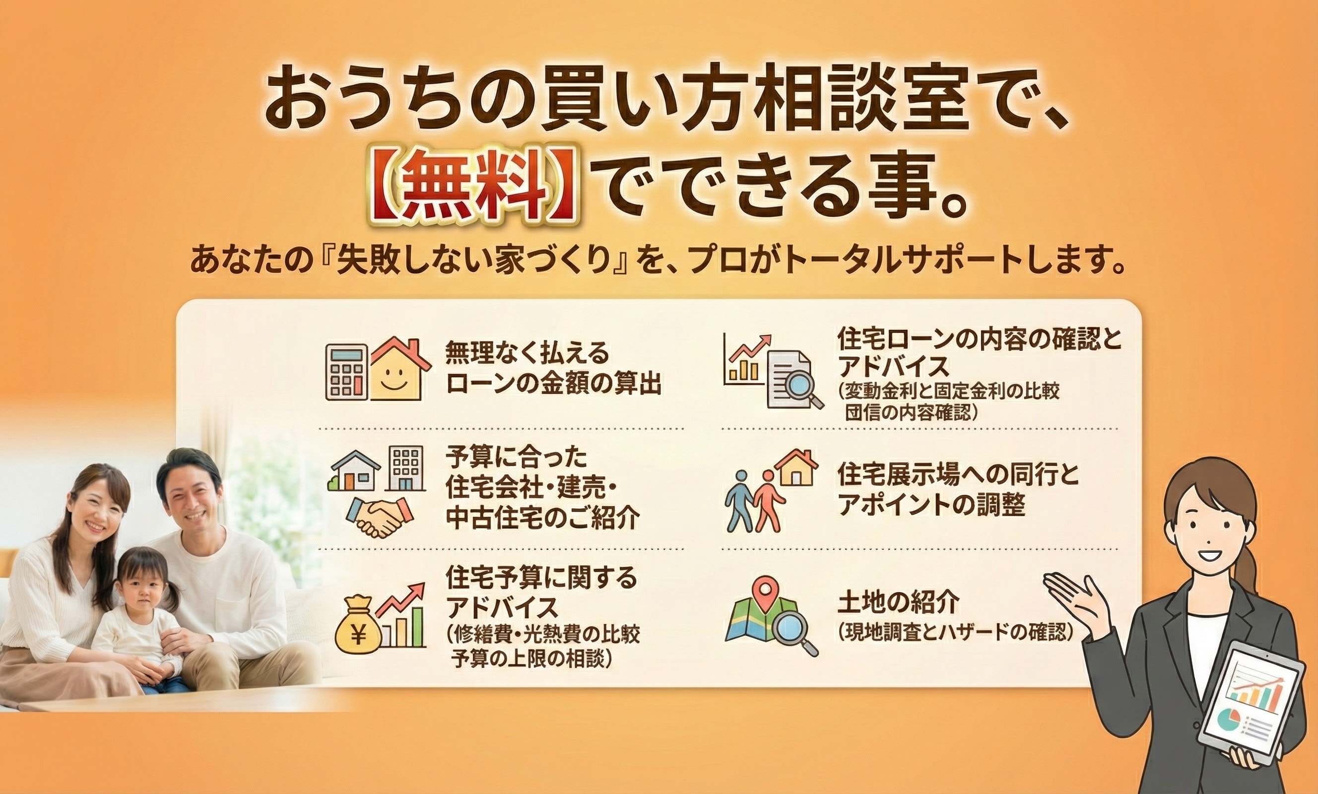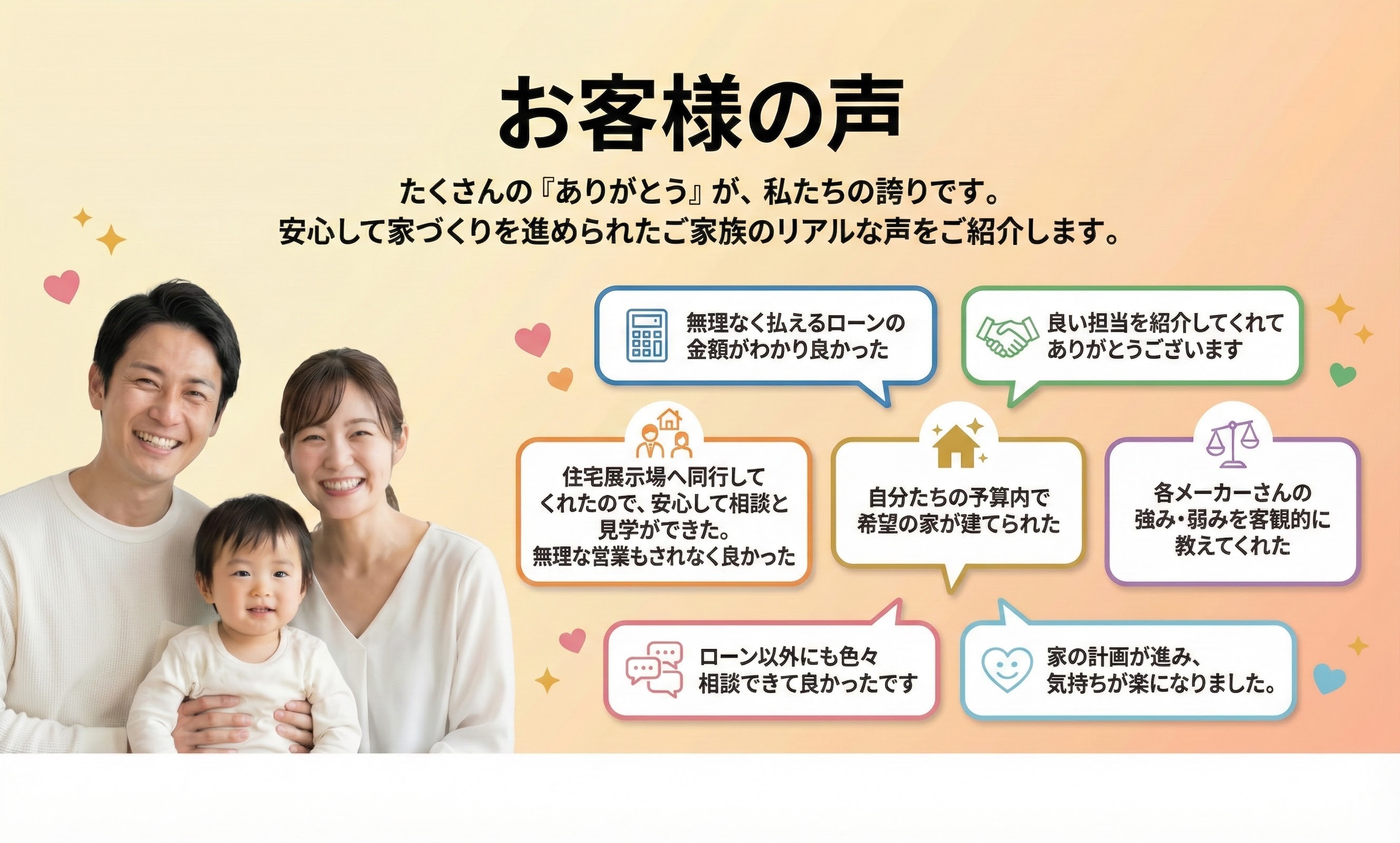 住宅会社や金融機関でない第三者目線での最適な選択肢を見つけ、「わからない」ことや「モヤモヤ」「不安」を解消し、スムーズで楽しい家づくりをサポートいたします。